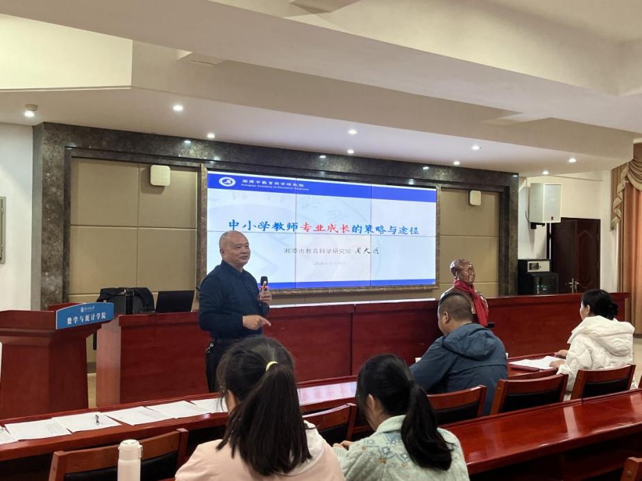 2025年11月11日上午,湖南科技大学数学与统计学院邀请优秀校友、湘潭市教科院周大明院长,在立志楼A601举办《中小学教师专业成长的策略与途径》专题讲座,为2022级数学与应用数学专业师范生开启《教育研习》序幕。活动由汪卫副院长主持,傅湘陵教授、湘潭市二中冯敏老师、丁爱霞副系主任及学生共同参与。