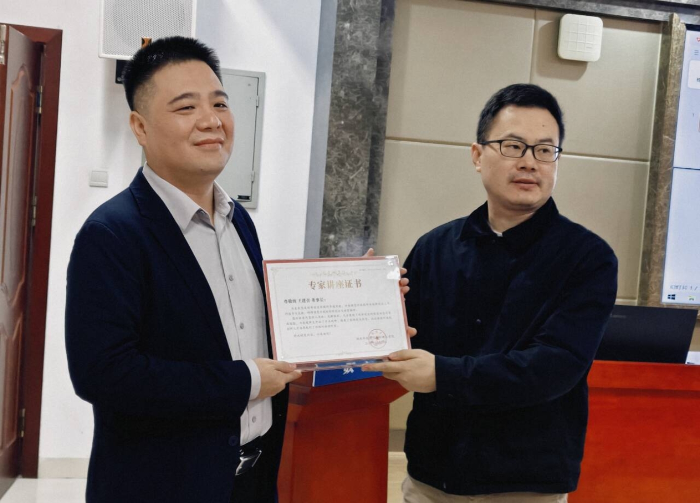 讲座尾声,创新创业学院管青军副院长为王进营先生颁发了创新创业大讲堂专家讲座证书。此次活动作为加强校企交流的重要契机,将进一步激发全校创新创业活力,共促交流平台持续发展。