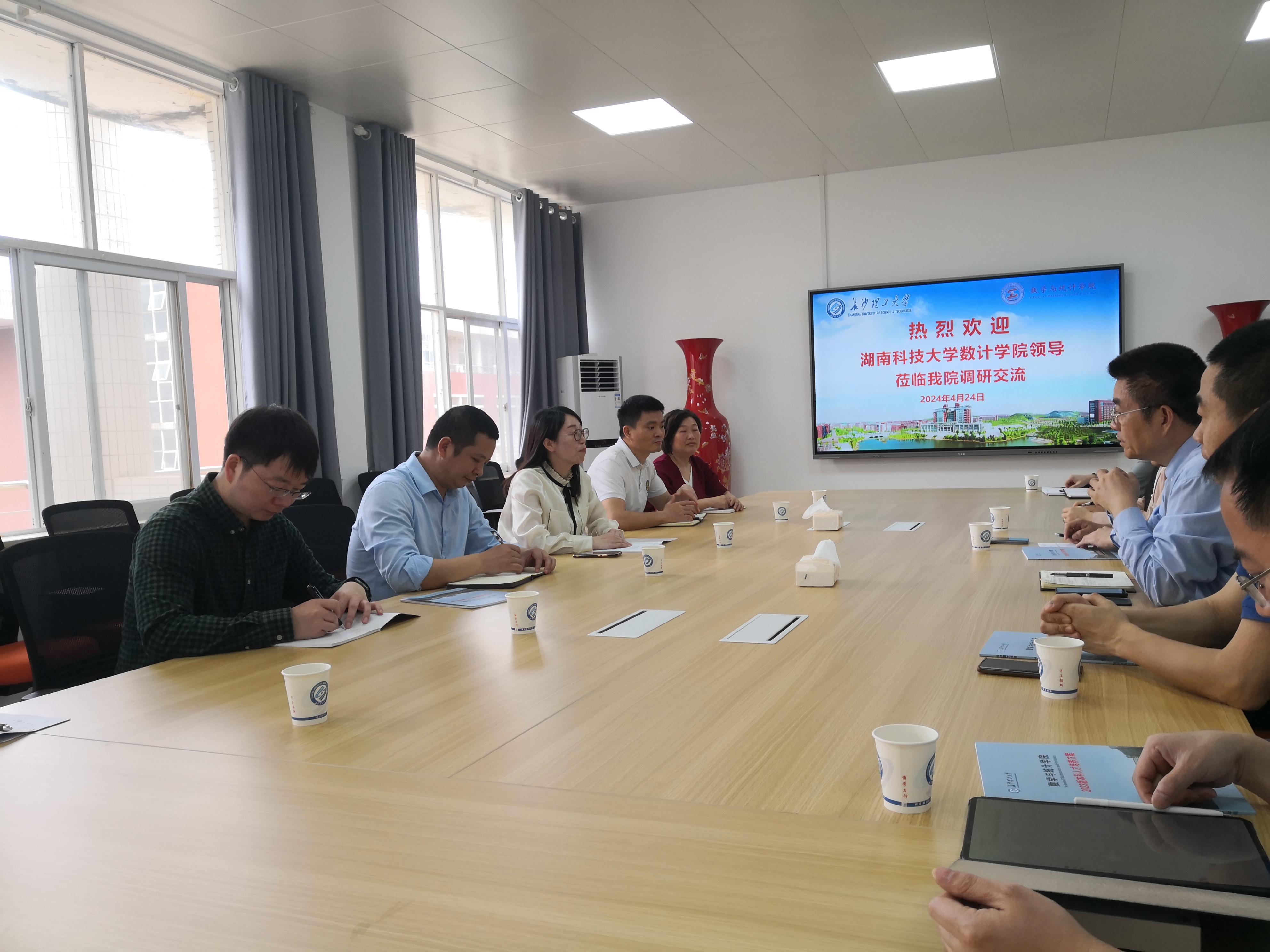 2024年4月24日上午,学院主持行政工作副院长李冬梅、教学副院长汪卫、信计系主任刘灯明、统计系主任李正阳、基础系主任谭敏、数学系副主任丁爱霞一行六人赴长沙理工大学数学与统计学院调研交流。