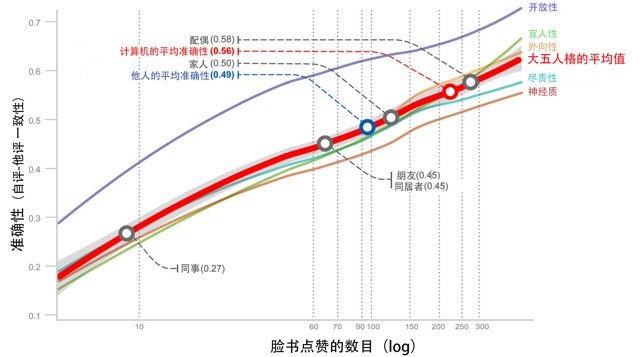 以计算机为基础的人格判断的准确性(y轴)与点赞数目(x轴)之间的关系。红线显示的是计算机对大五人格判断的平均准确性,他人判断的准确性也在这条红线上标出。因为该样本中个体的平均点赞数为227,由此得到计算机在这个点赞数目下的平均准确性为0.56,这比来自他人判断的平均准确性(0.46)要更高,而与配偶判断的准确性(0.58,这也是最好的他人判断准确性)相近。在研究中,可以看到随着点赞数目的增加,计算机的判断准确性也在增加;当点赞数超过500时,可以看到该判断准确性可达0.66。而且,相比于其它个性特征,以点赞为基础的模型对于开放性的判断有着最高准确性。图片来源:研究论文